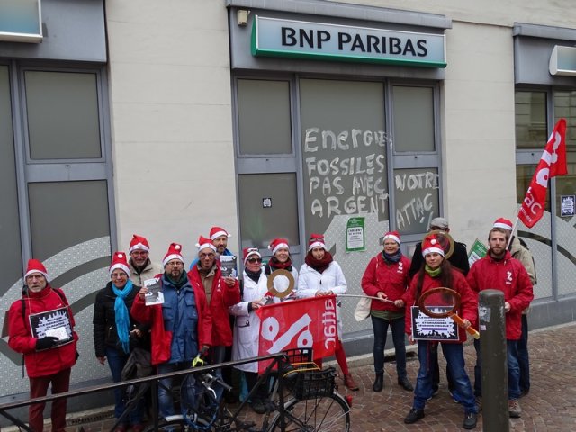 Les militant·e·s dénonçaient en particulier l’utilisation qui est faite par la BNP et la Société Générale de l’épargne du Livret de Développement Durable et Solidaire (LDDS), dans le cadre de la campagne nationale #PasAvecNotreArgent.